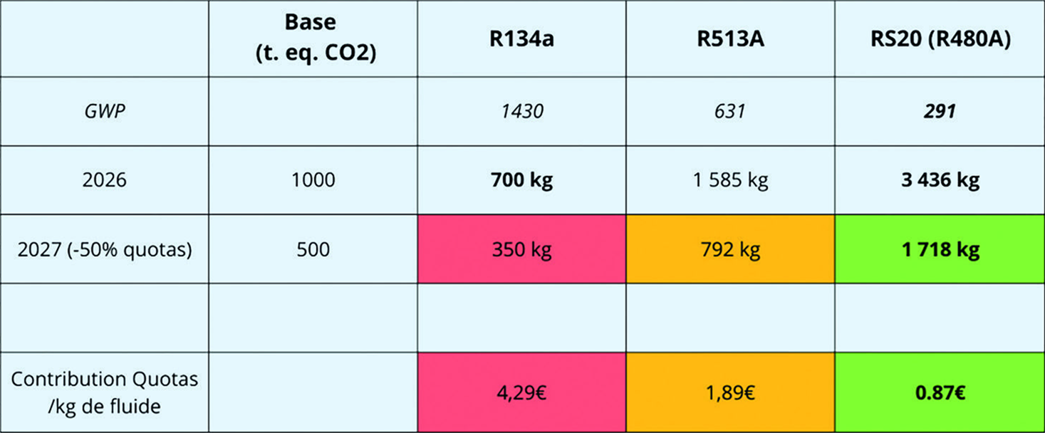 Continuons l'exemple : En 2027, 500 teaCO, permettent d'acheter 350 kg de R134a contre 1718 kg de R480A. Donc pour continuer de faire fonctionner les installations au R134a, il faut absolument utiliser des fluides avec les plus faibles GWP. Le RS20 (R480A), est le fluide de rétrofit du R134a à plus faible GWP. II est A1 non inflammable, a un GWP de 291 (5 fols inférleur au R134a). Il est donc moins impacté par les quotas, et autorisé même après 2032 (GWP max. de 750 pour la maintenance de la réfrigération).